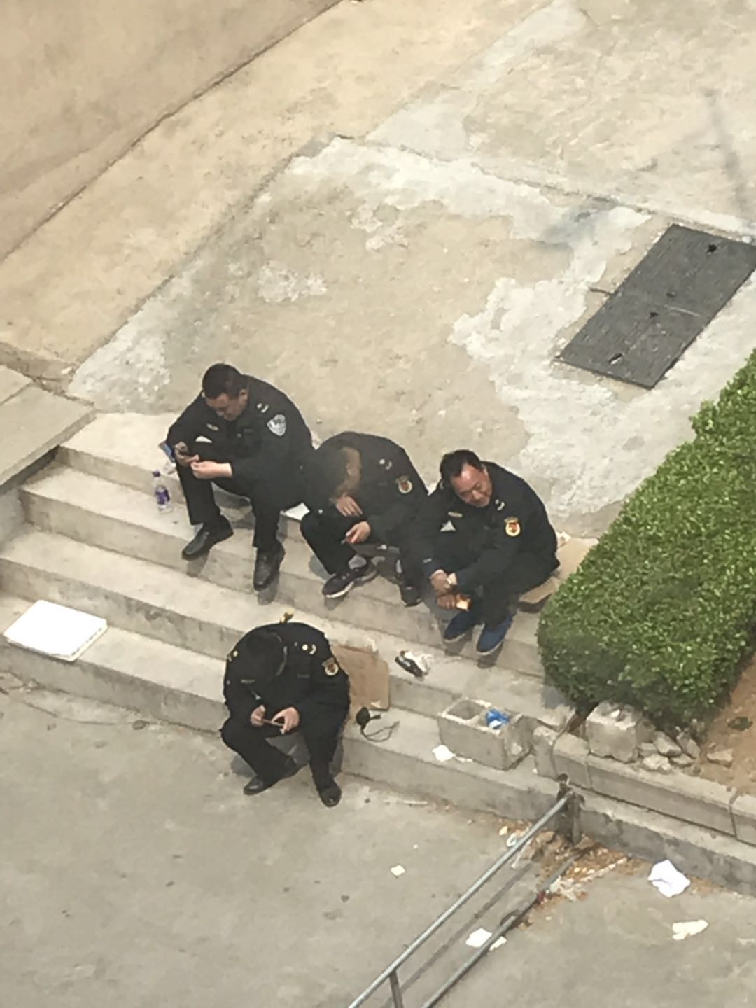 無残な西門屋台と携帯で遊ぶ警察官・・・。
