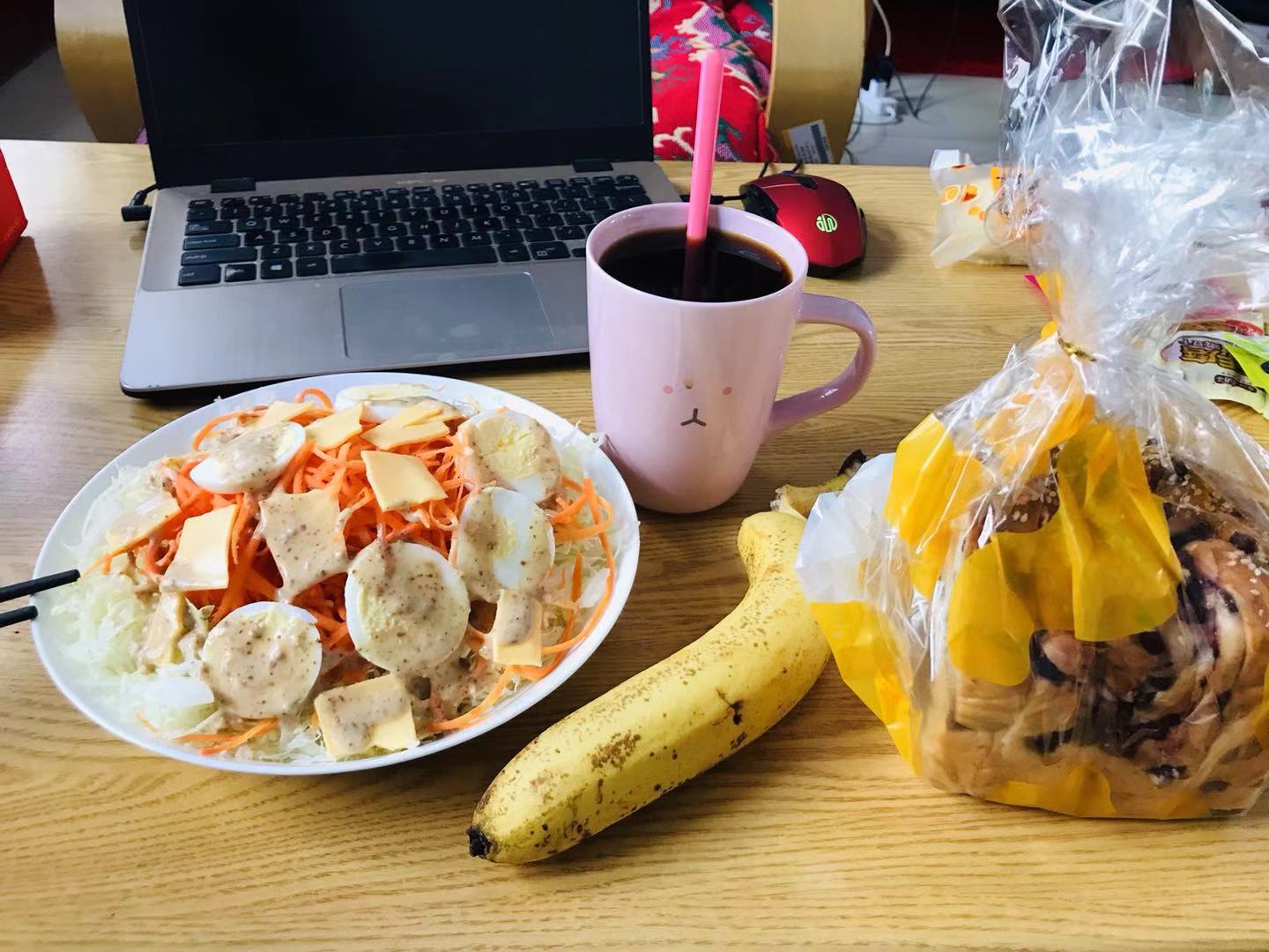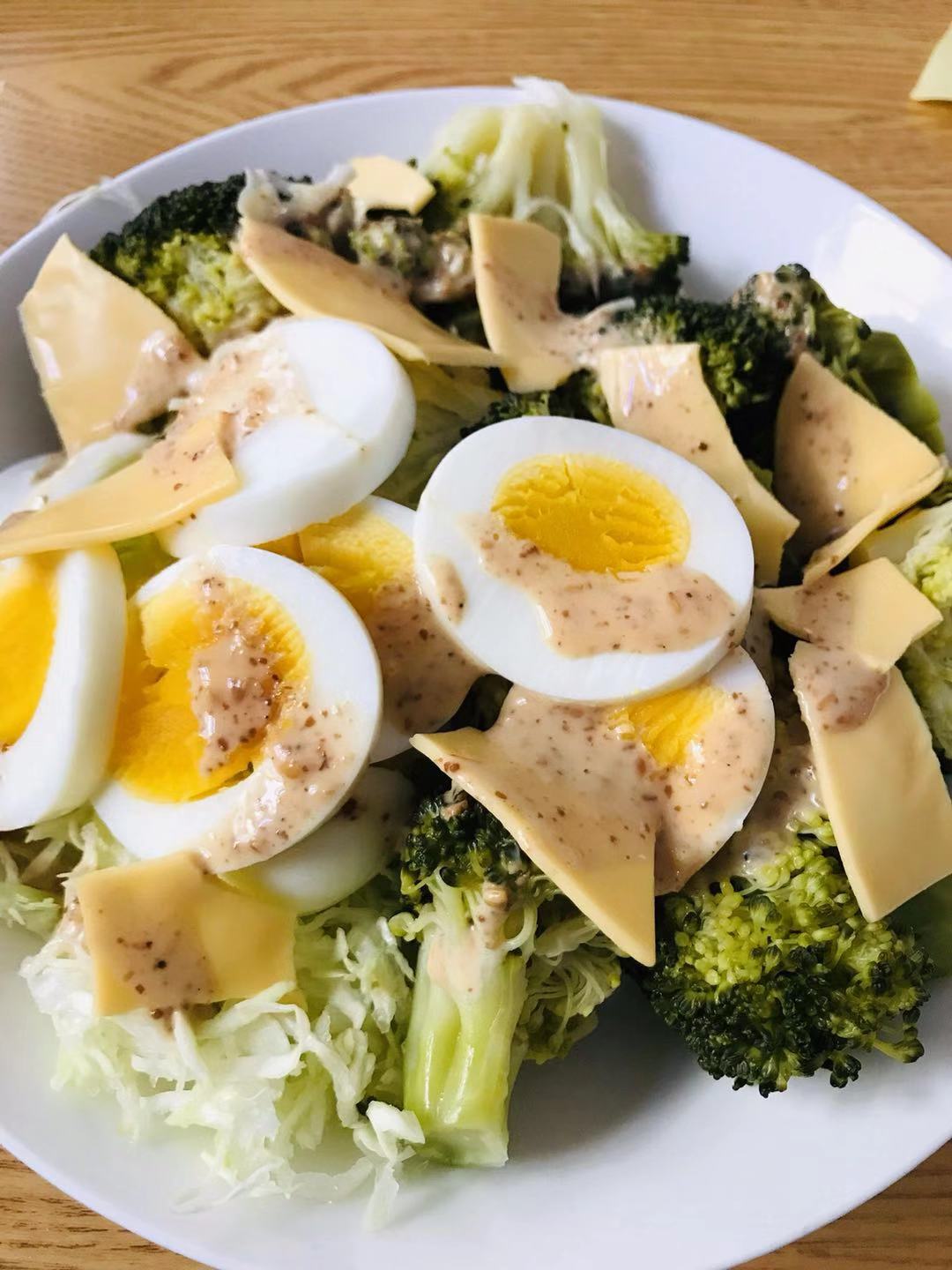 今日の昼ご飯。キャベツ、玉ねぎ、人参、たまご、チーズのサラダ。