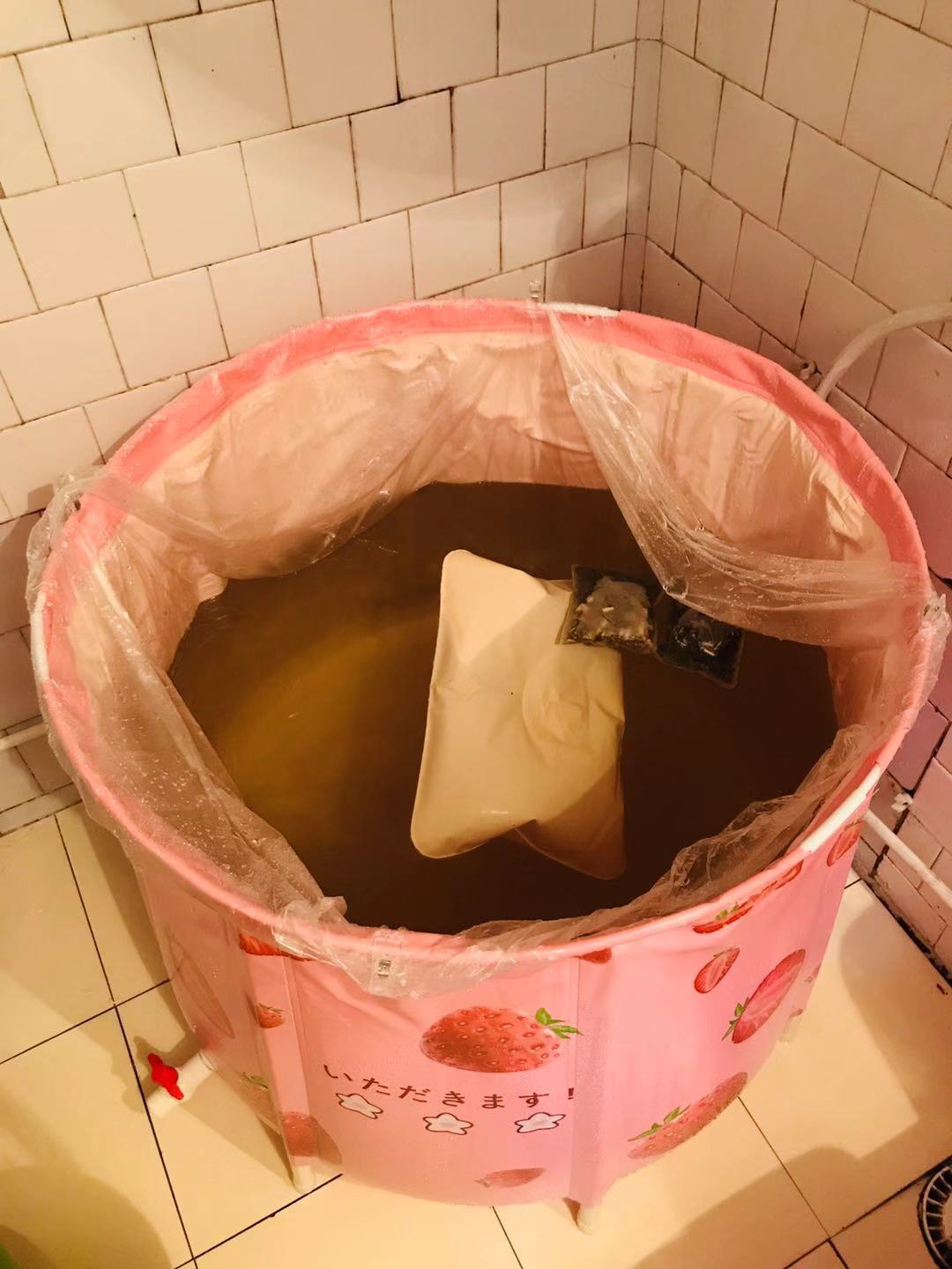 手前のバケツの茶色いのは煮出してる漢方入浴剤