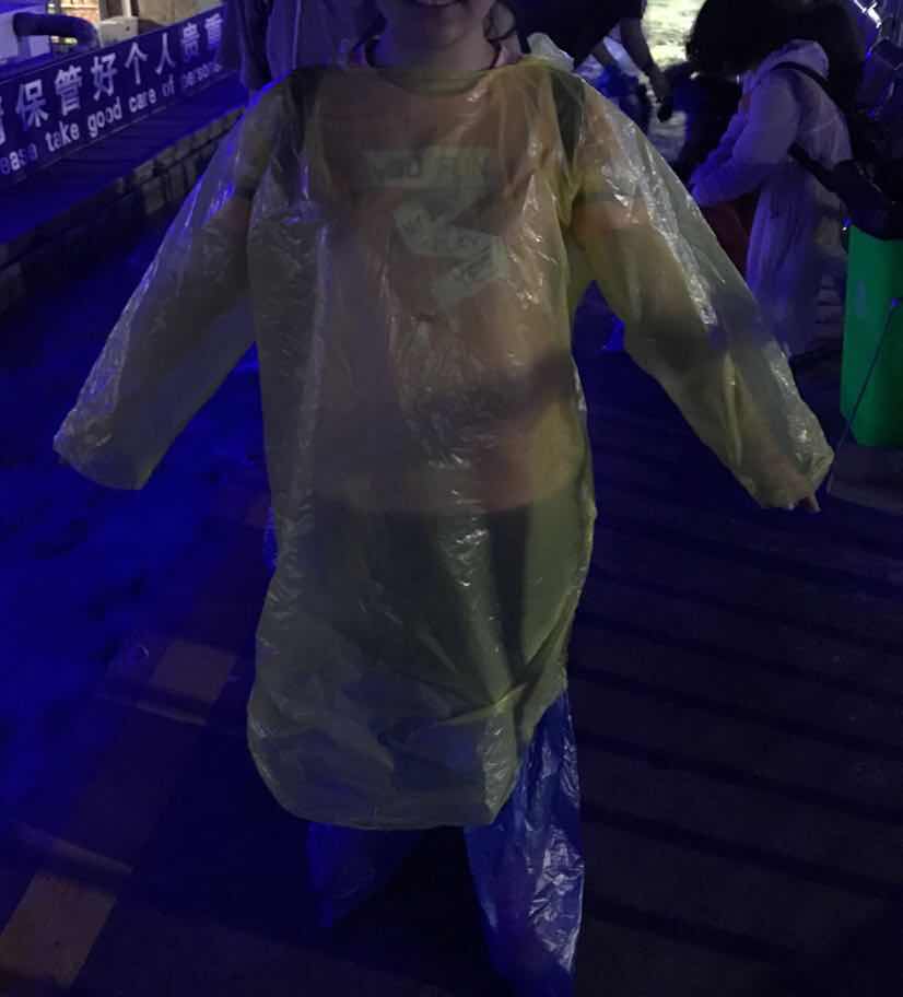 さらに泰山で雷雨にあった際買ったカッパを着る委員長。
